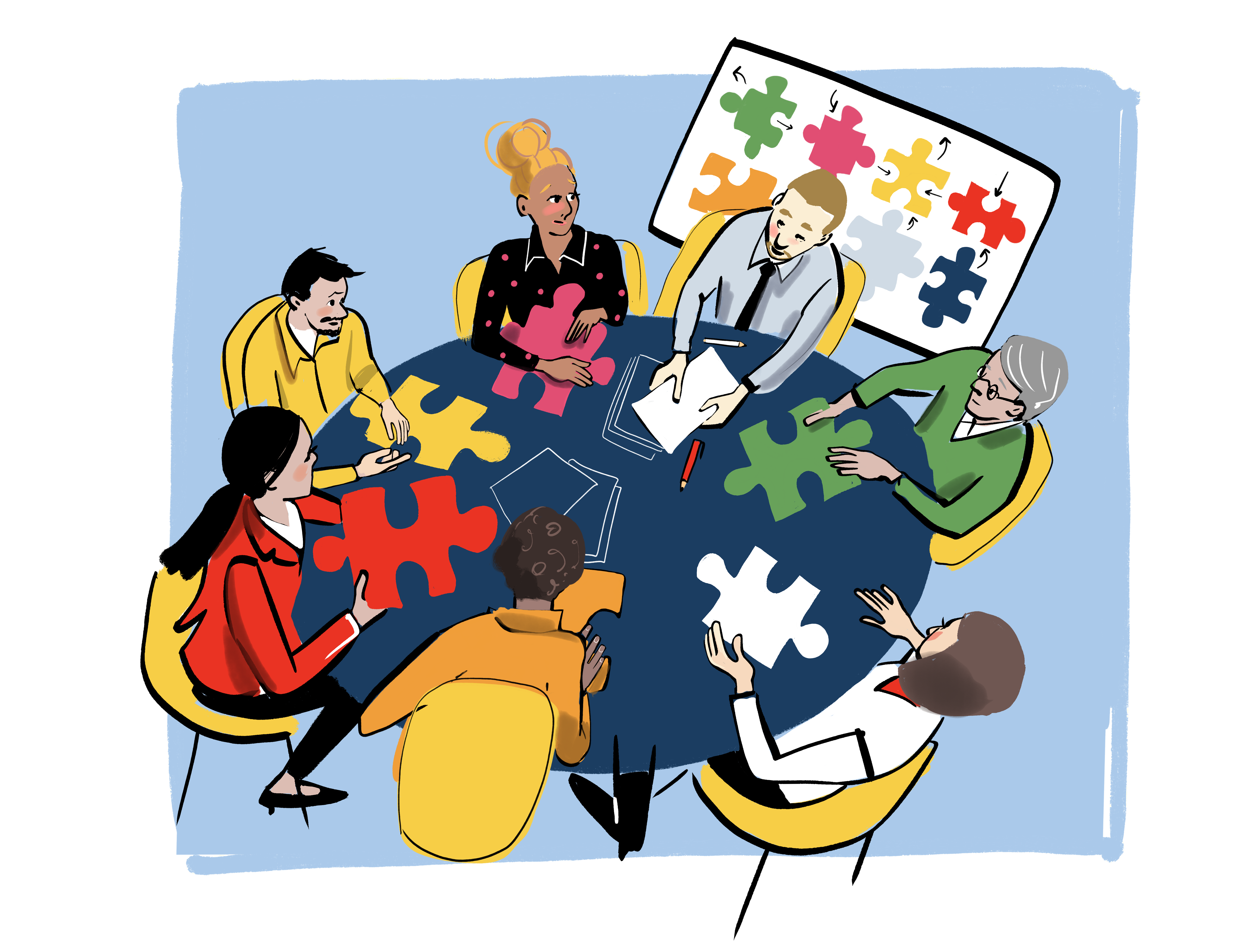 In team coaching, there is a single goal shared by all participants, and everyone contributes to achieving it. The coach's role is to encourage the team to reflect on the practices and methods of interaction between members in relation to achieving the common goal, increasing everyone's awareness of working as a team rather than as separate individuals.